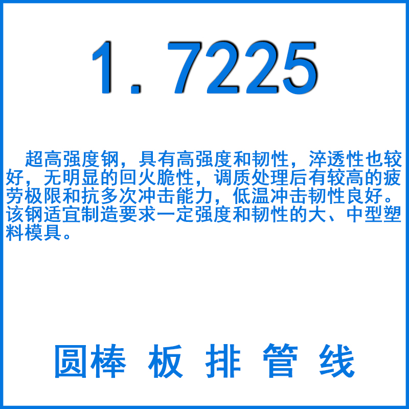 1.7225鋼材,此鋼擁有良好的加工性,加工變形微小,抗疲勞性能相當(dāng)好,屬中等等淬透性鋼,1.7225熱處理后有較好的強(qiáng)度和良好的綜合力學(xué)性能,工藝性好,成材率高.最高使用溫度為427攝氏度.1.7225強(qiáng)度、淬透性高,韌性好,淬火時(shí)變形小,高溫時(shí)有高的蠕變強(qiáng)度和持久強(qiáng)度。用于制造要求較35CrMo鋼強(qiáng)度更高和調(diào)質(zhì)截面更大的鍛件,如機(jī)車牽引用的大齒輪、增壓器傳動(dòng)齒輪、后軸、受載荷極大的連桿及彈簧夾,也可用于 2000m以下石油深井鉆桿接頭與打撈工具,并且可以用于折彎?rùn)C(jī)的模具等。