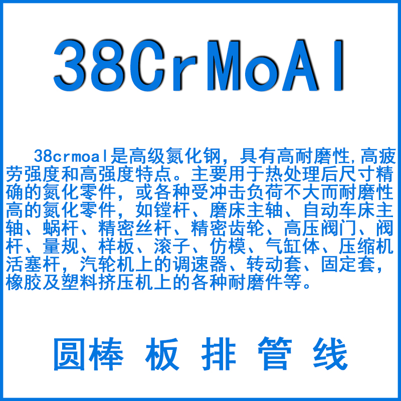38crmoal是高級(jí)氮化鋼,具有高耐磨性,高疲勞強(qiáng)度和高強(qiáng)度特點(diǎn)。主要用于熱處理后尺寸精確的氮化零件,或各種受沖擊負(fù)荷不大而耐磨性高的氮化零件,如鏜桿、磨床主軸、自動(dòng)車床主軸、蝸桿、精密絲桿、精密齒輪、高壓閥門、閥桿、量規(guī)、樣板、滾子、仿模、氣缸體、壓縮機(jī)活塞桿,汽輪機(jī)上的調(diào)速器、轉(zhuǎn)動(dòng)套、固定套,橡膠及塑料擠壓機(jī)上的各種耐磨件等。