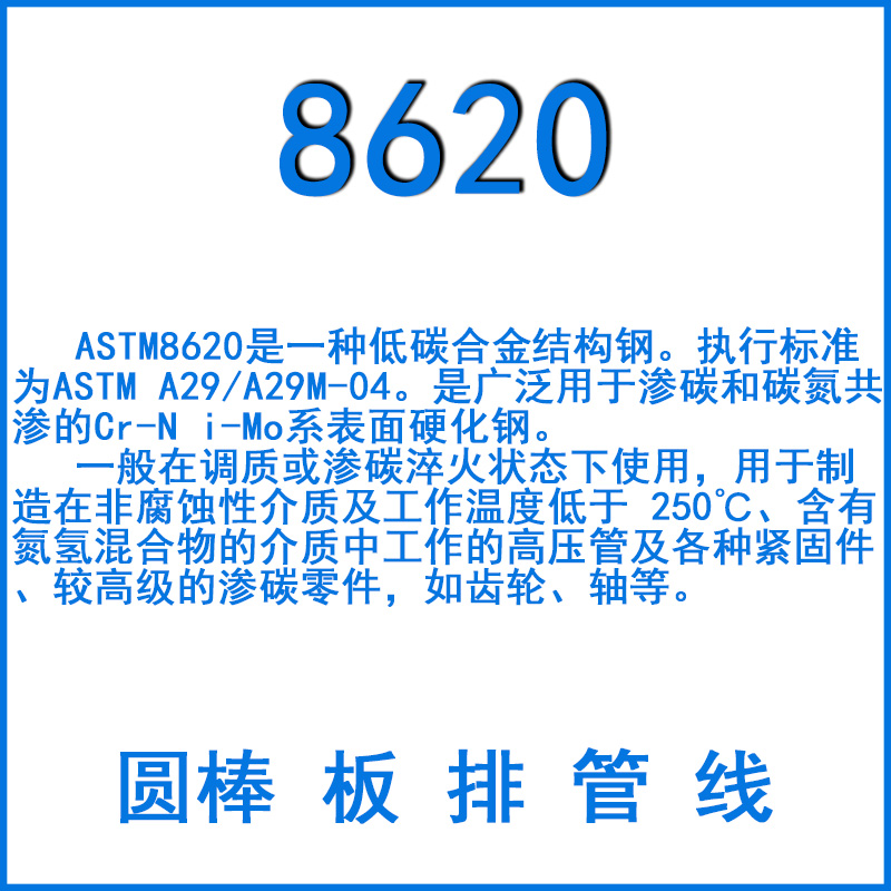 ASTM8620是一種低碳合金結(jié)構鋼。執(zhí)行標準為ASTM A29/A29M-04。是廣泛用于滲碳和碳氮共滲的Cr-N i-Mo系表面硬化鋼。