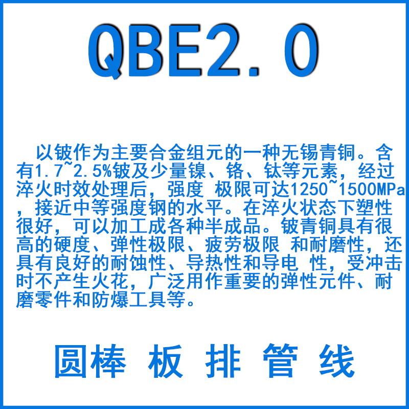 鋁(Al)≤0.15,硅(Si)≤0.15,鉛(Pb)≤0.005,(Cu)余量,鐵(Fe)≤0.15,鈹(Be)1.8~2.1,鎳(Ni)0.2~0.4,雜質(zhì)總各%≤0.5