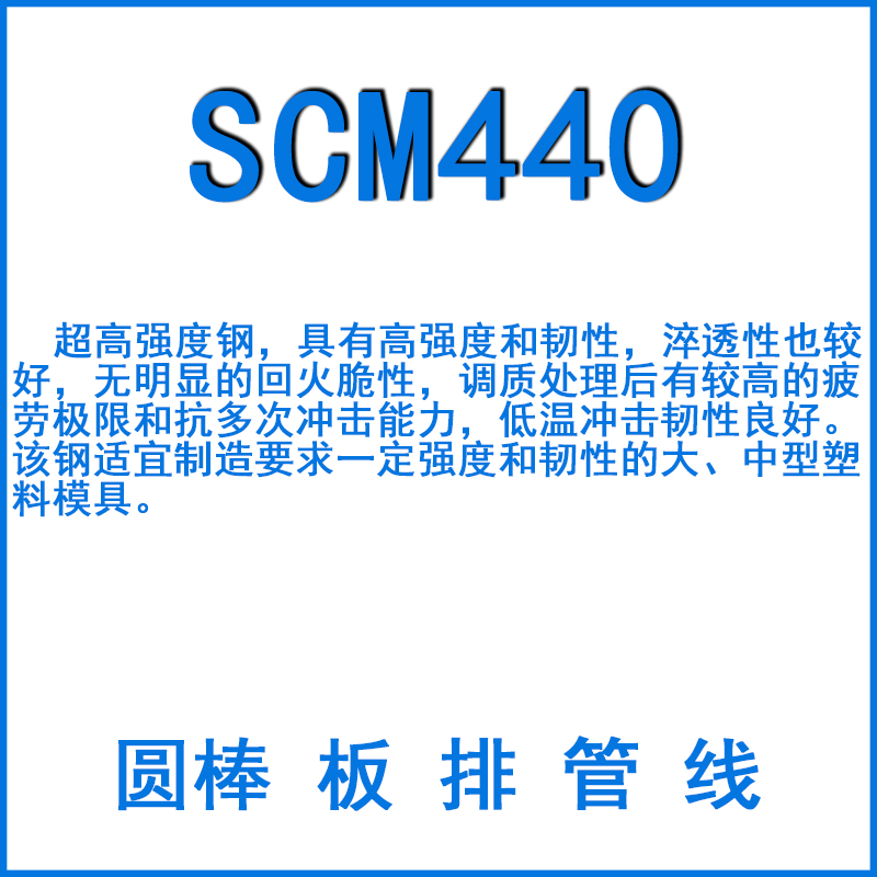 SCM440鋼材,此鋼擁有良好的加工性,加工變形微小,抗疲勞性能相當(dāng)好,屬中等等淬透性鋼,SCM440熱處理后有較好的強(qiáng)度和良好的綜合力學(xué)性能,工藝性好,成材率高.最高使用溫度為427攝氏度.SCM440強(qiáng)度、淬透性高,韌性好,淬火時變形小,高溫時有高的蠕變強(qiáng)度和持久強(qiáng)度。用于制造要求較35CrMo鋼強(qiáng)度更高和調(diào)質(zhì)截面更大的鍛件,如機(jī)車牽引用的大齒輪、增壓器傳動齒輪、后軸、受載荷極大的連桿及彈簧夾,也可用于 2000m以下石油深井鉆桿接頭與打撈工具,并且可以用于折彎機(jī)的模具等。